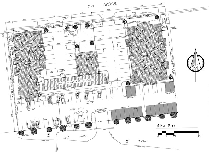 - Yamnuska Village - Building B: Two stories containing a proposed 24 seat coffee shop on the main floor and 4 condo accommodation units.